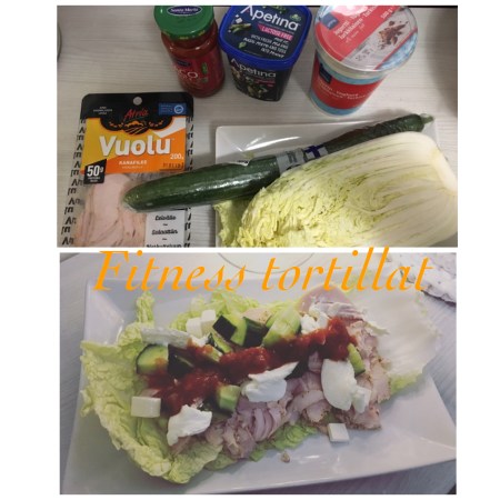 Fitness Tortillat (kiinankaali jonka päälle kana, salaatti, alle 10% feta, sokeriton tacokastike ja turkkilainen jogurtti)